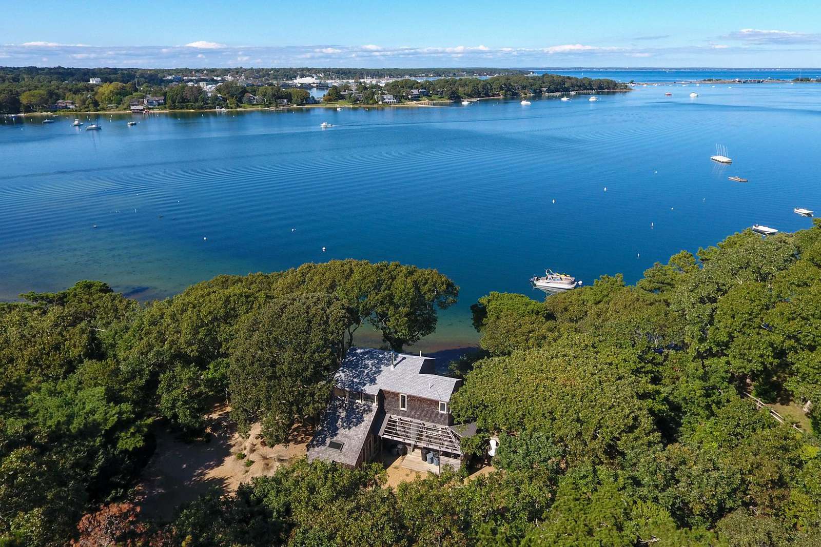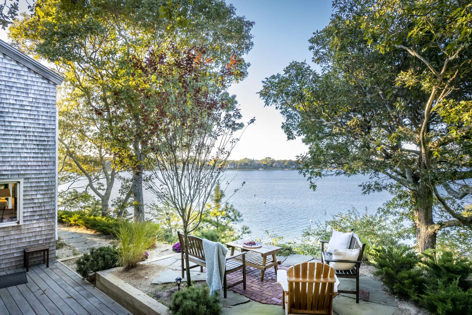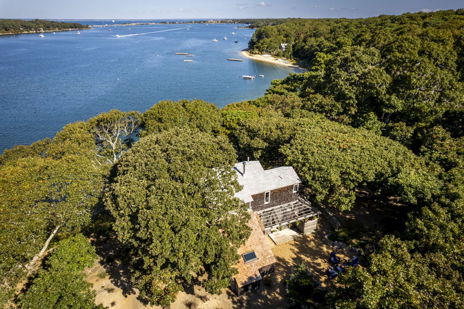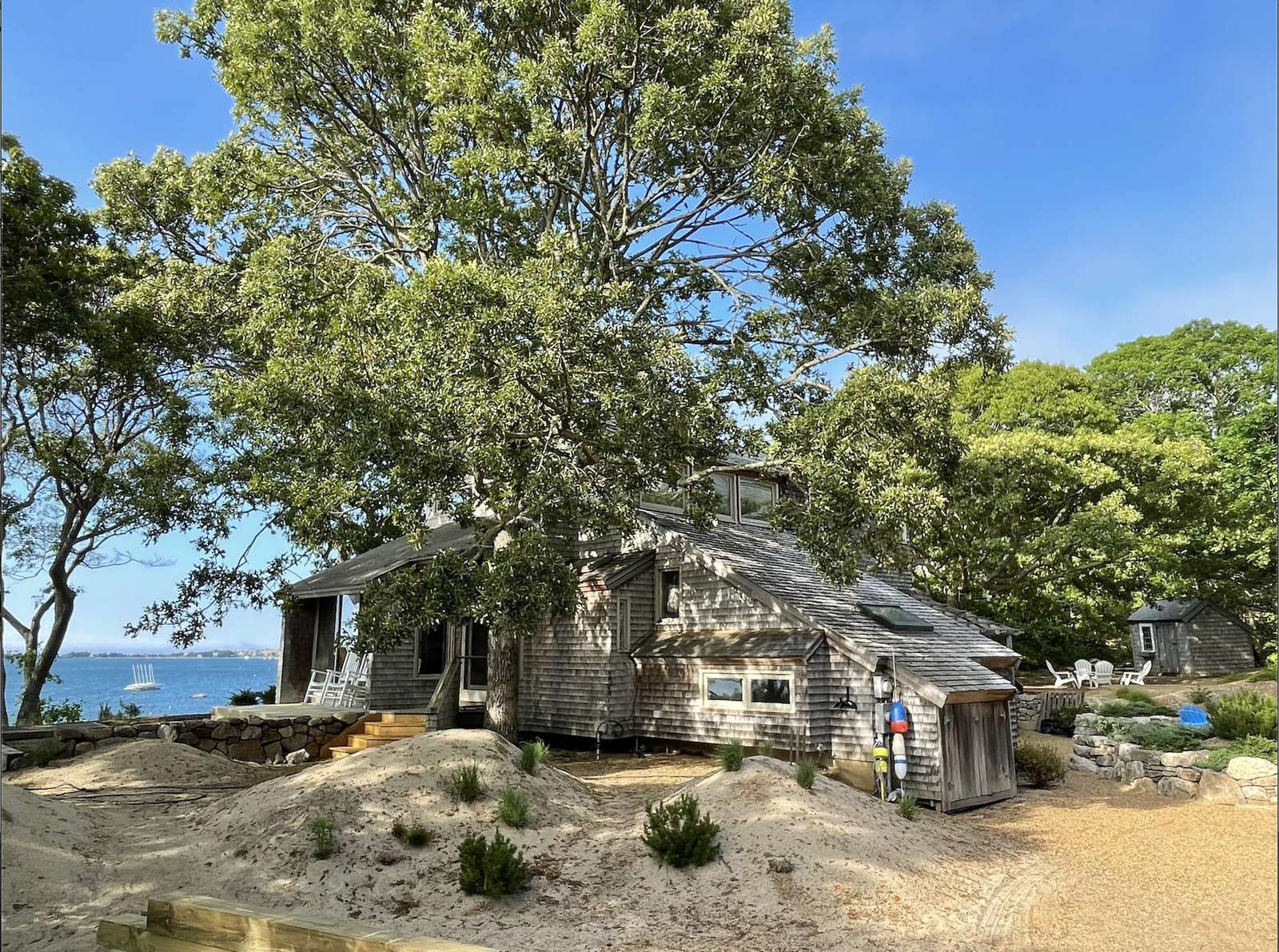 Stunning 3-level waterfront cottage perched above the Lagoon with panoramic views, private sandy beach, spacious decks, central A/C, and unforgettable sunsets. A true Martha’s Vineyard escape.