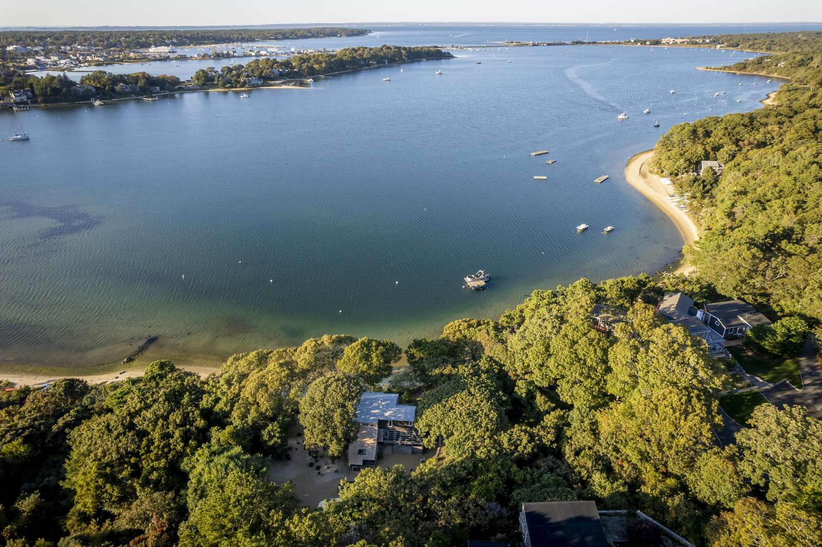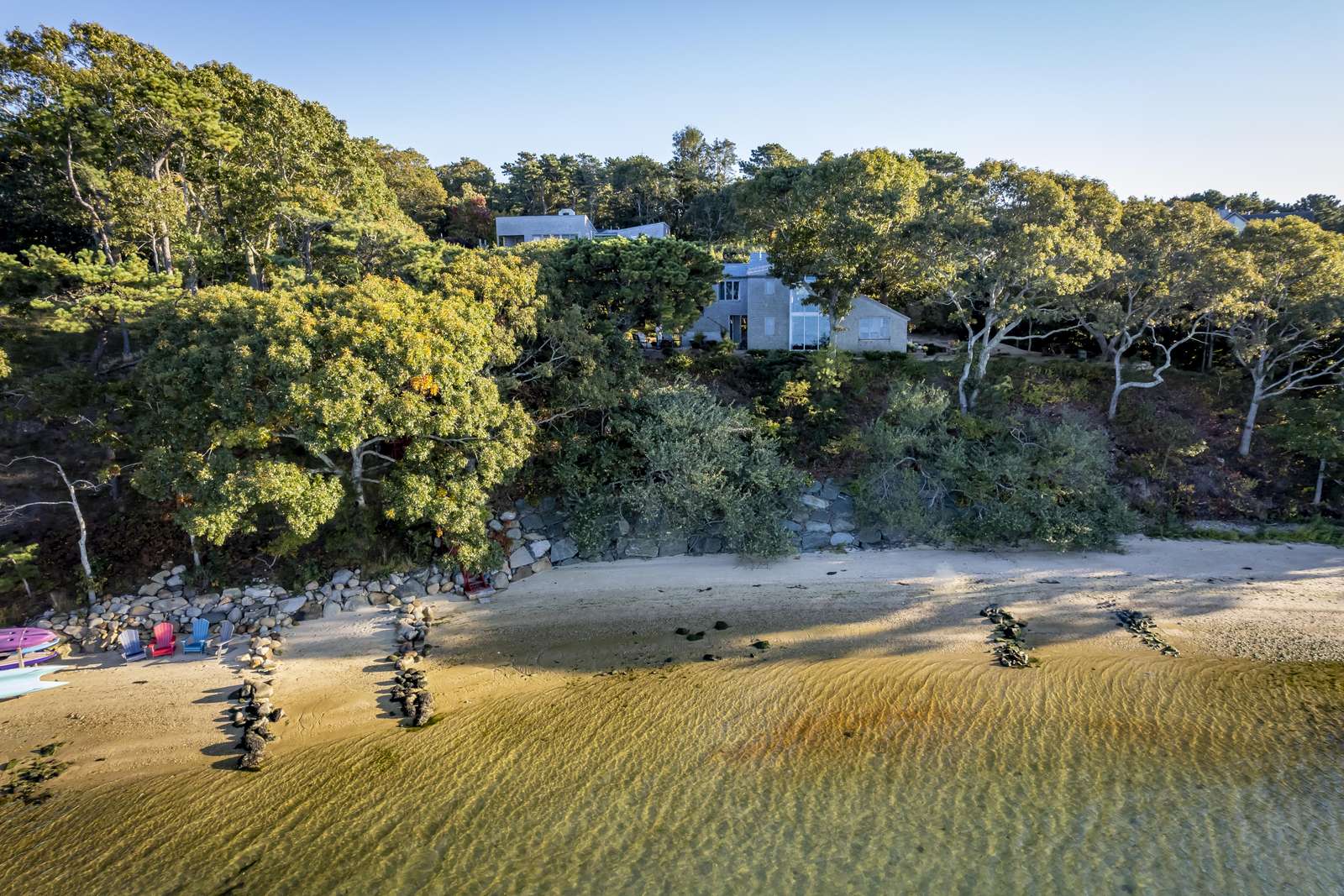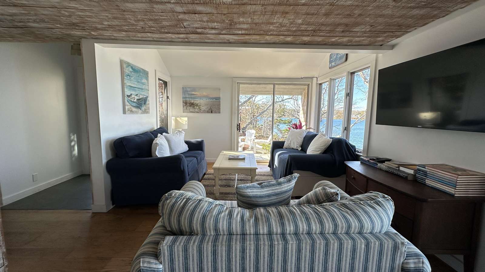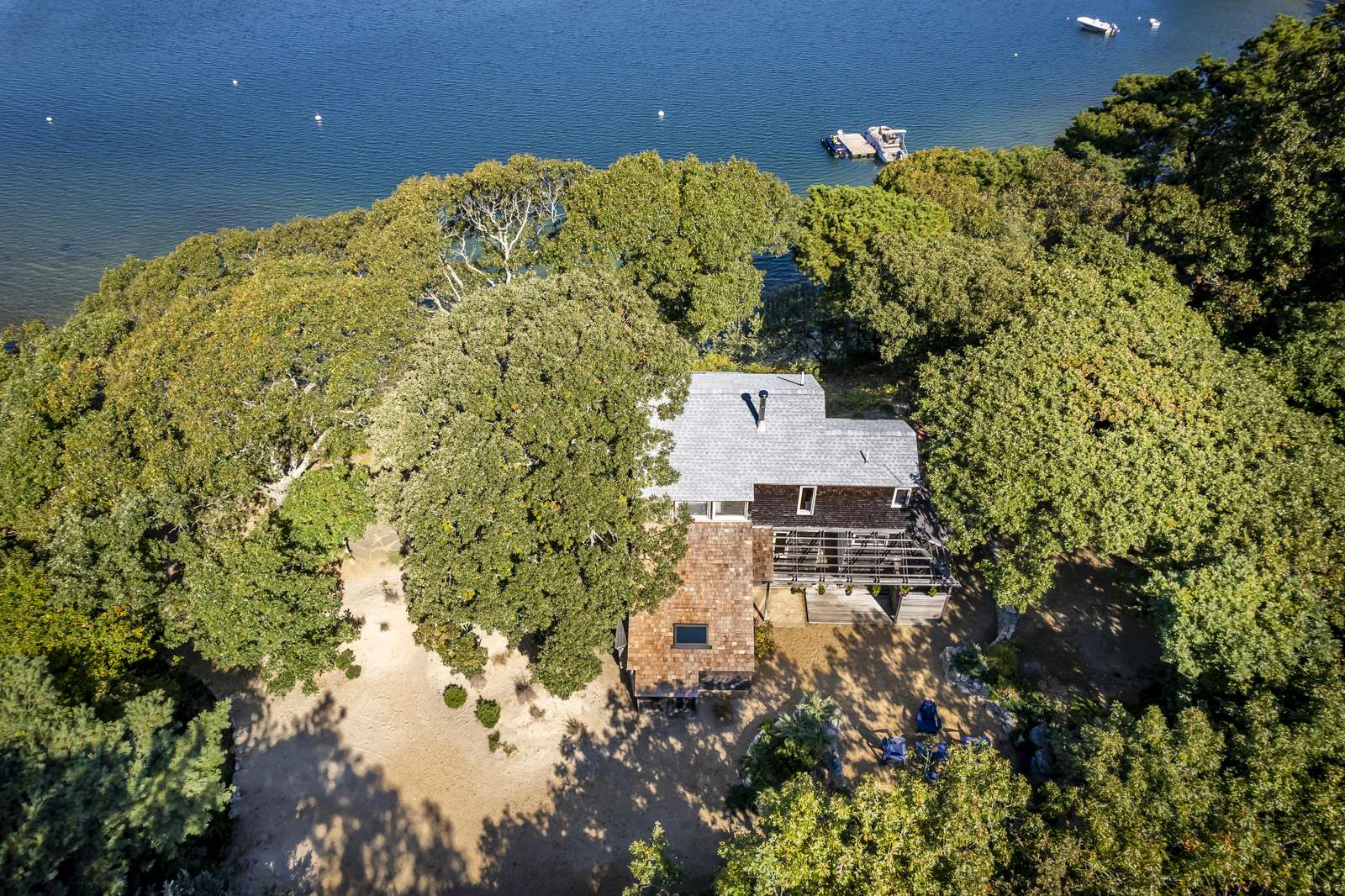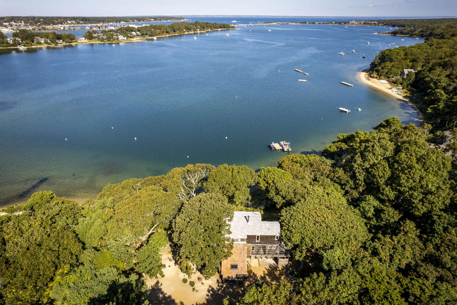 Stunning 3-level waterfront cottage perched above the Lagoon with panoramic views, private sandy beach, spacious decks, central A/C, and unforgettable sunsets. A true Martha’s Vineyard escape.
