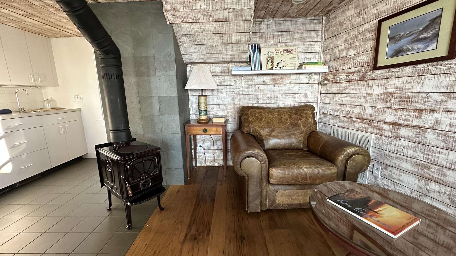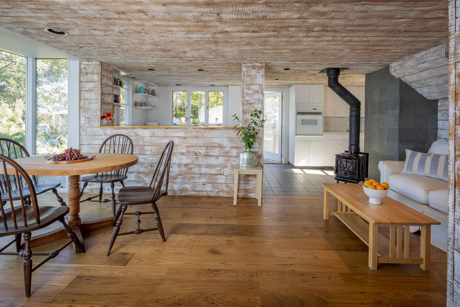 Inside, the first level welcomes you with light, warmth, and stunning water views from every angle. Reclaimed chestnut flooring, a tiled kitchen, and large picture windows create a relaxed, coastal atmosphere. The open-concept layout is perfect for gathering, dining, and enjoying morning coffee against a backdrop of sparkling blue water. The lower level features a private bedroom with direct access to the oceanside deck, plus a large outdoor shower—an essential Vineyard luxury. Upstairs, the primary bedroom enjoys sweeping views and shares a full bath with another flexible bedroom that doubles as an office or reading nook. A lofted lounge area offers sky views and water vistas that stretch for miles.