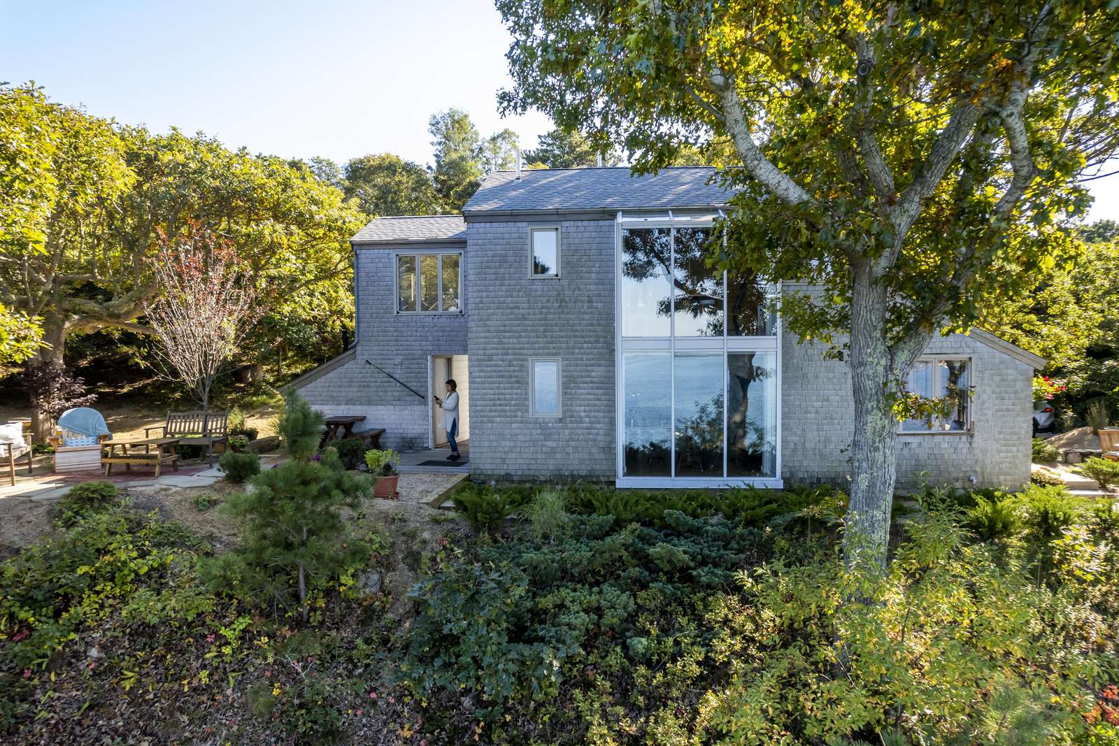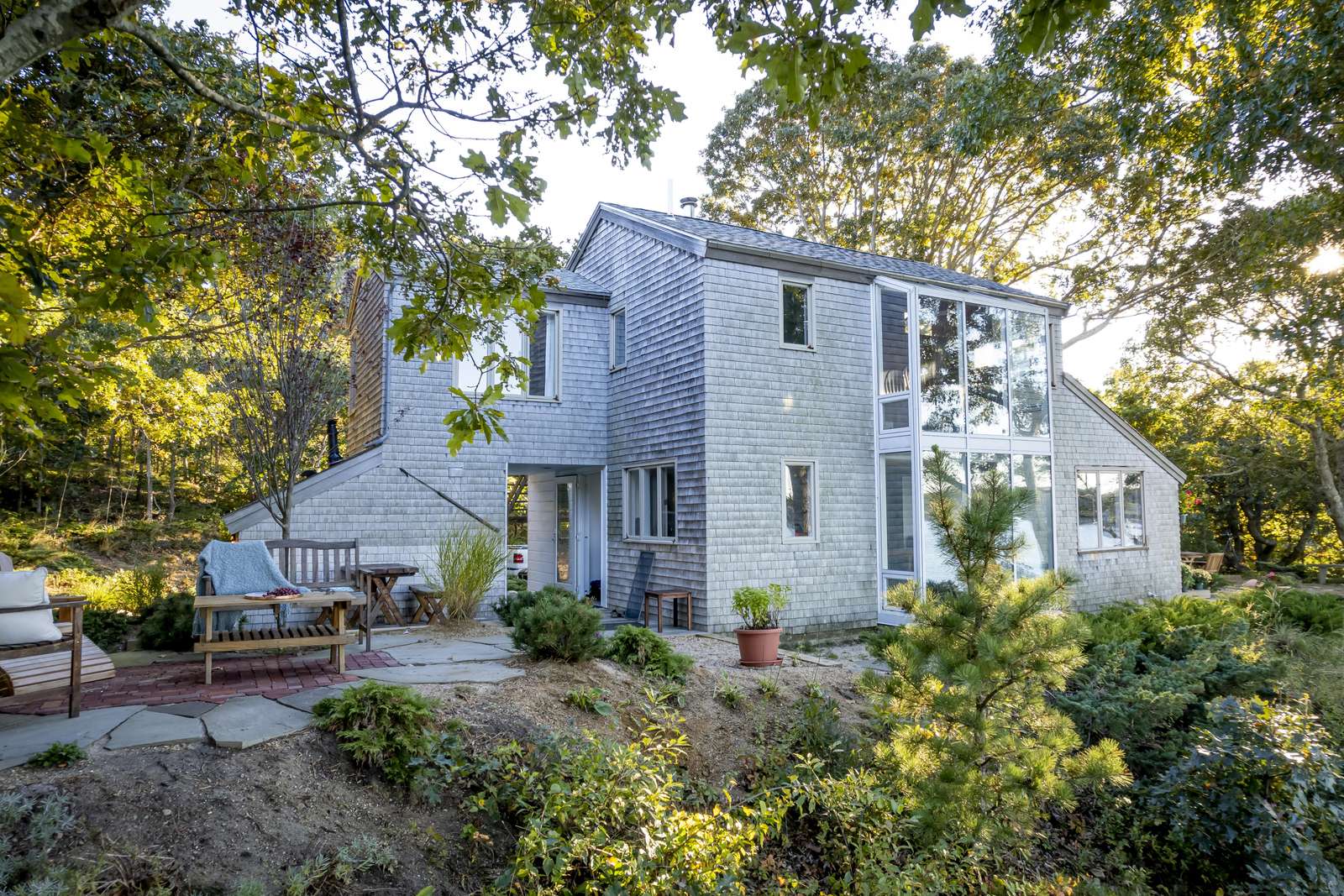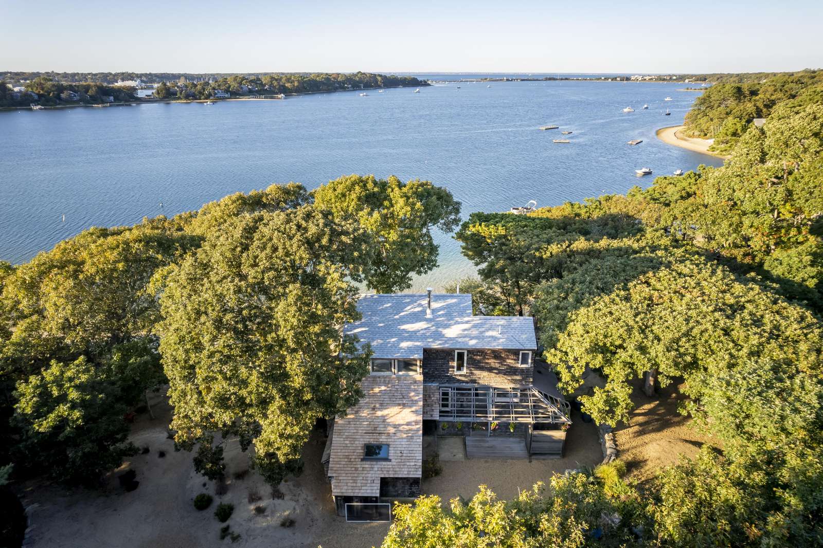 Discover one of the most magical waterfront experiences on Martha’s Vineyard at "The Westlake House", a unique three-level Vineyard-style cottage perched atop a 25-foot bluff overlooking the shimmering waters of Lagoon Pond and Nantucket Sound. With panoramic views, direct beach access, and postcard-perfect sunsets, this home captures everything you dream of in an island vacation. Follow the private wooded path down to over 110 feet of your own sandy shoreline—calm, clean, and ideal for kayaking, paddleboarding, canoeing, and swimming. Gentle breezes make this a spectacular spot for sailing or windsurfing, and you’ll love watching the ferry glide in and out of Vineyard Haven across the bay.