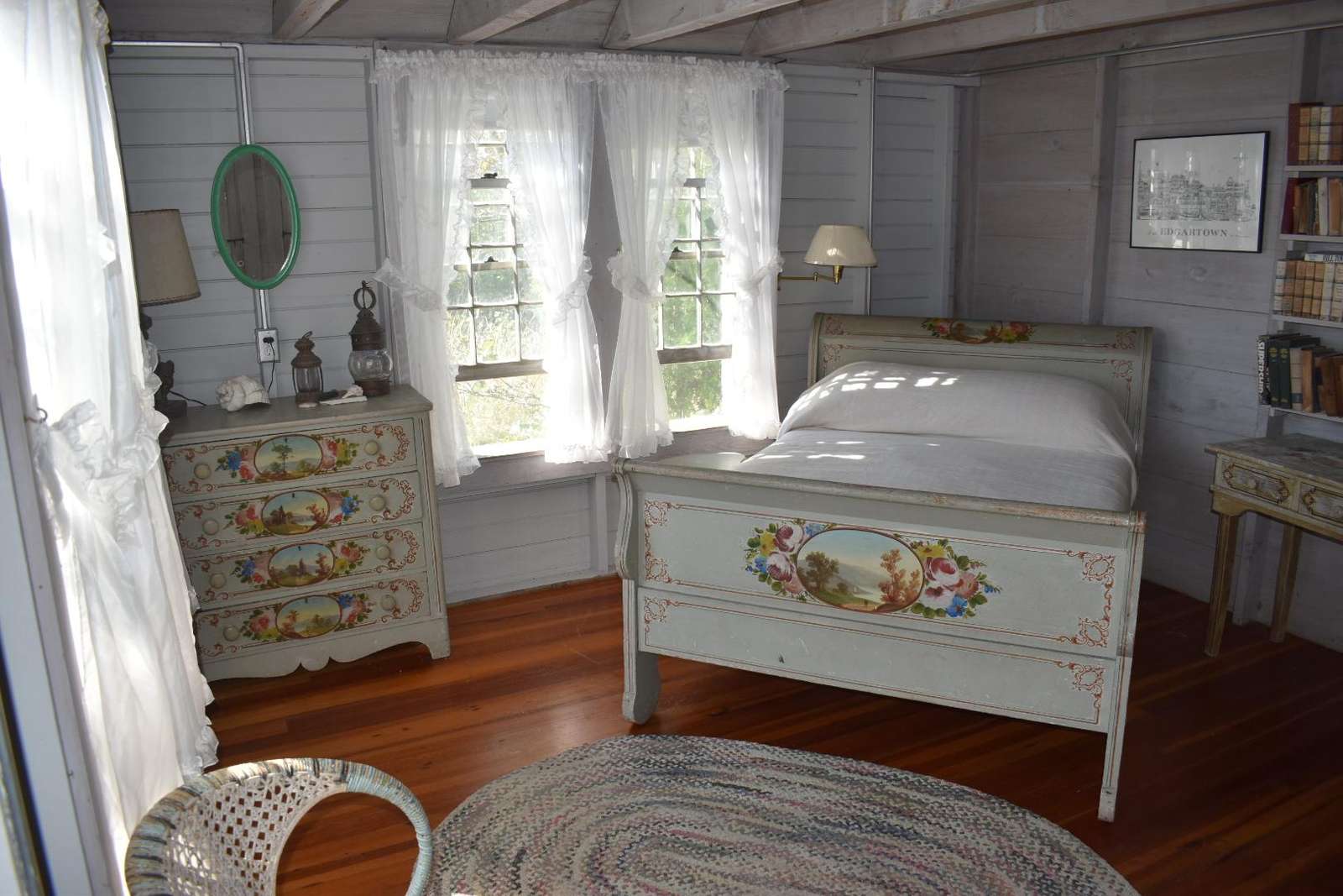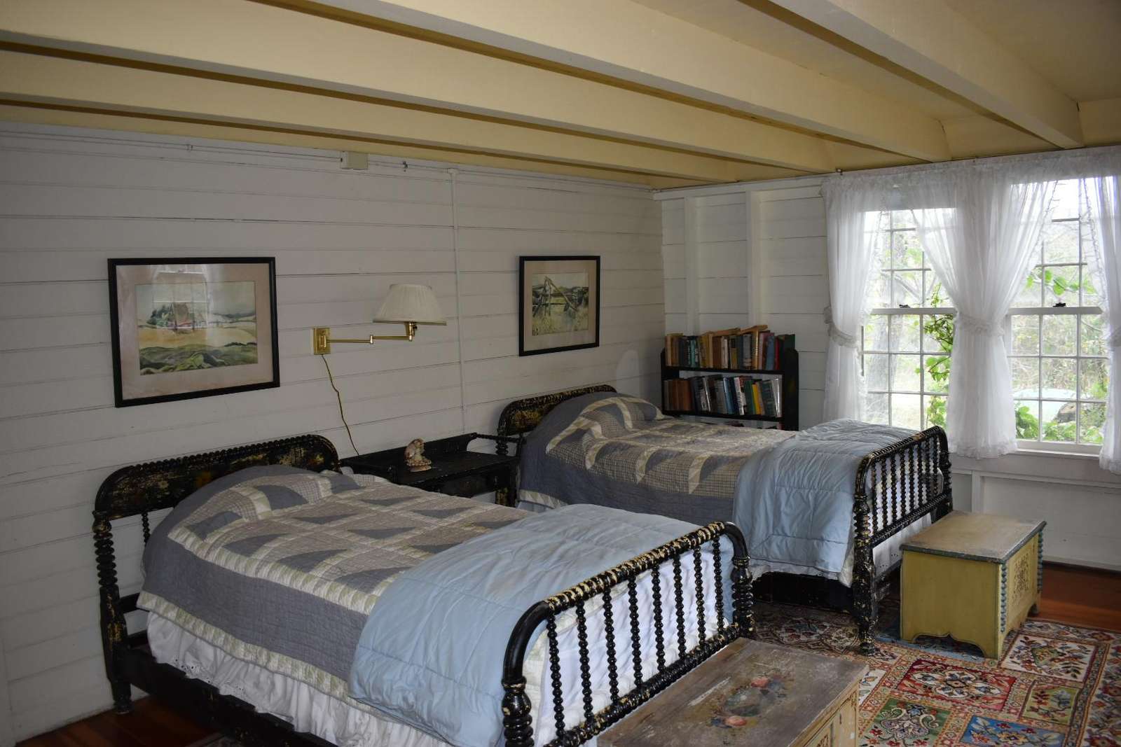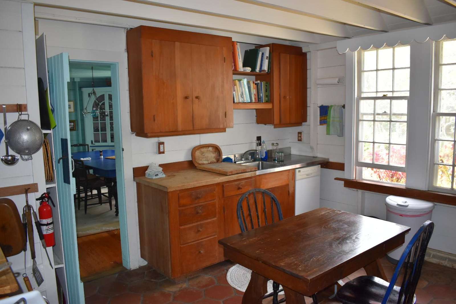 The original portion of the home features the kitchen, dining room, and a generous living room centered around a large wood-burning fireplace. The fireplace draws well and includes a built-in wood cupboard. Fine art pieces decorate both the living and dining rooms, and each space comfortably seats ten. From the living room, doors open directly onto a terrace overlooking Nantucket Sound! Perfect for outdoor dining or morning coffee with ocean views.The primary suite includes both a double bed and a single bed, as well as a small sitting area with a television. The primary bathroom offers a tiled step-in shower. Just off the bedroom is a private office area with Wi-Fi and a computer desk. This office is separated from both the bedroom and the bedroom wing by doors, providing privacy and quiet workspace.