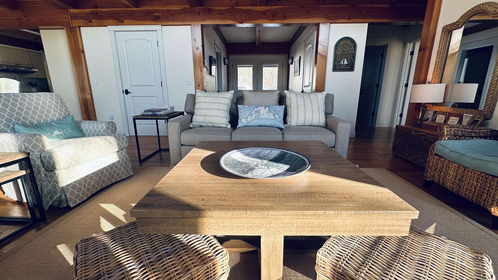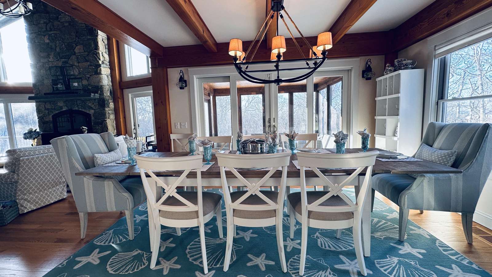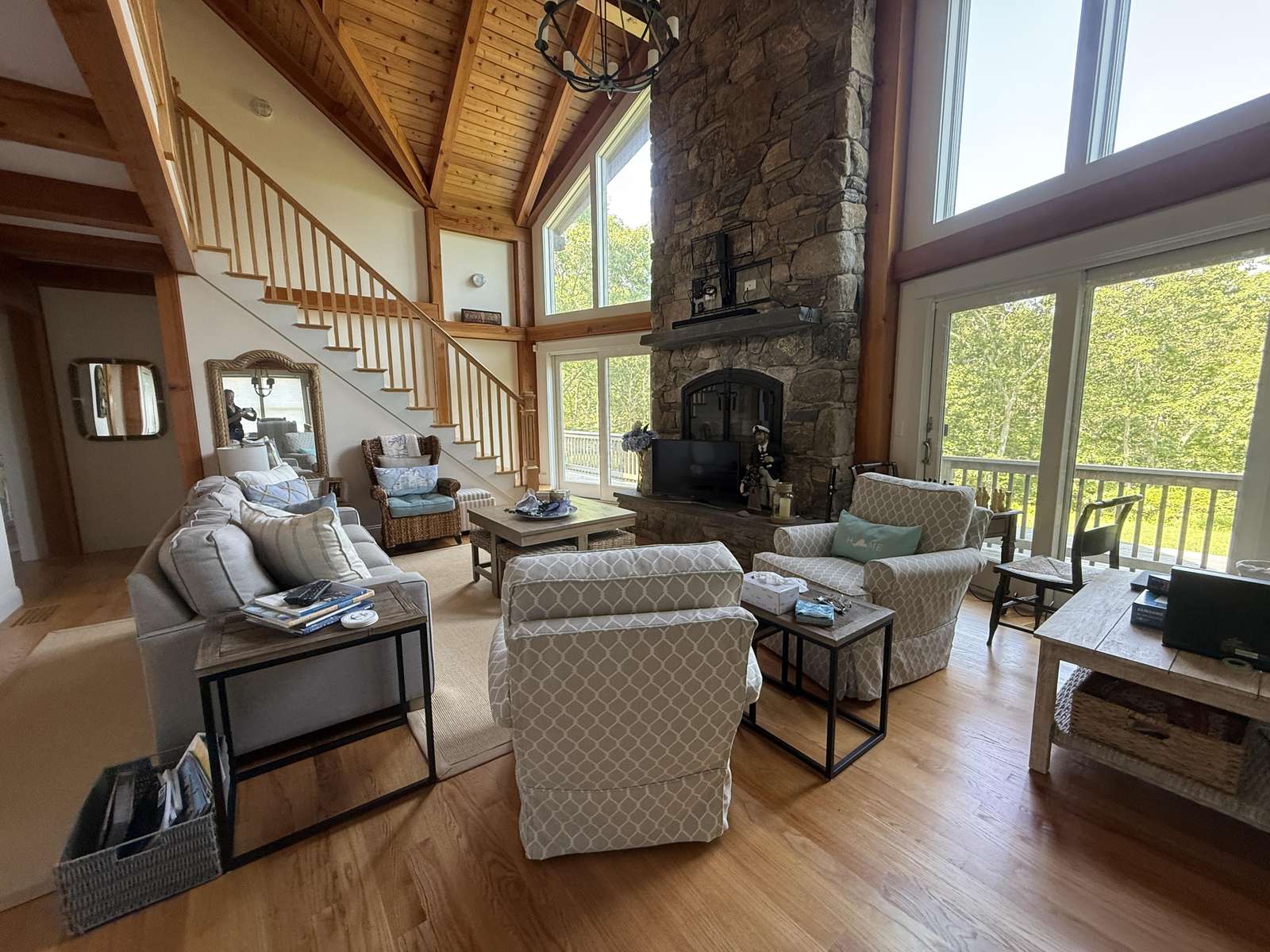The interior is thoughtfully designed for both gathering and retreat. Generous common spaces invite connection, while multiple bedroom suites provide privacy and quiet when needed. The living areas are warm and welcoming, anchored by a cozy fireplace that adds charm on cooler evenings and extends the home’s comfort beyond peak summer months.