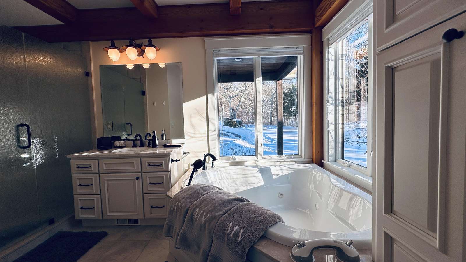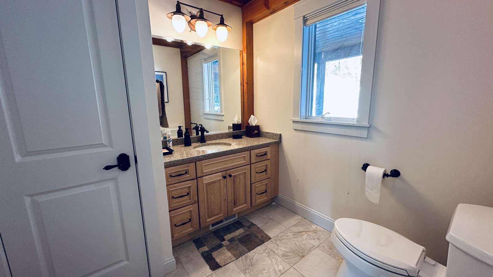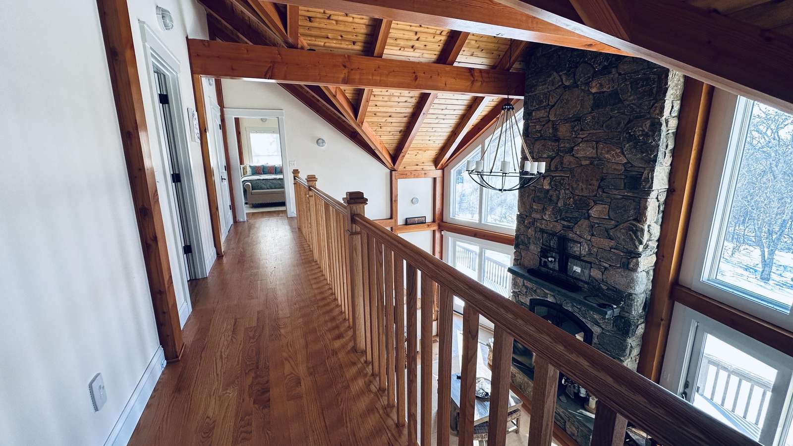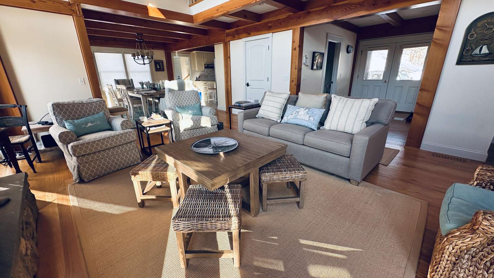The interior is thoughtfully designed for both gathering and retreat. Generous common spaces invite connection, while multiple bedroom suites provide privacy and quiet when needed. The living areas are warm and welcoming, anchored by a cozy fireplace that adds charm on cooler evenings and extends the home’s comfort beyond peak summer months.