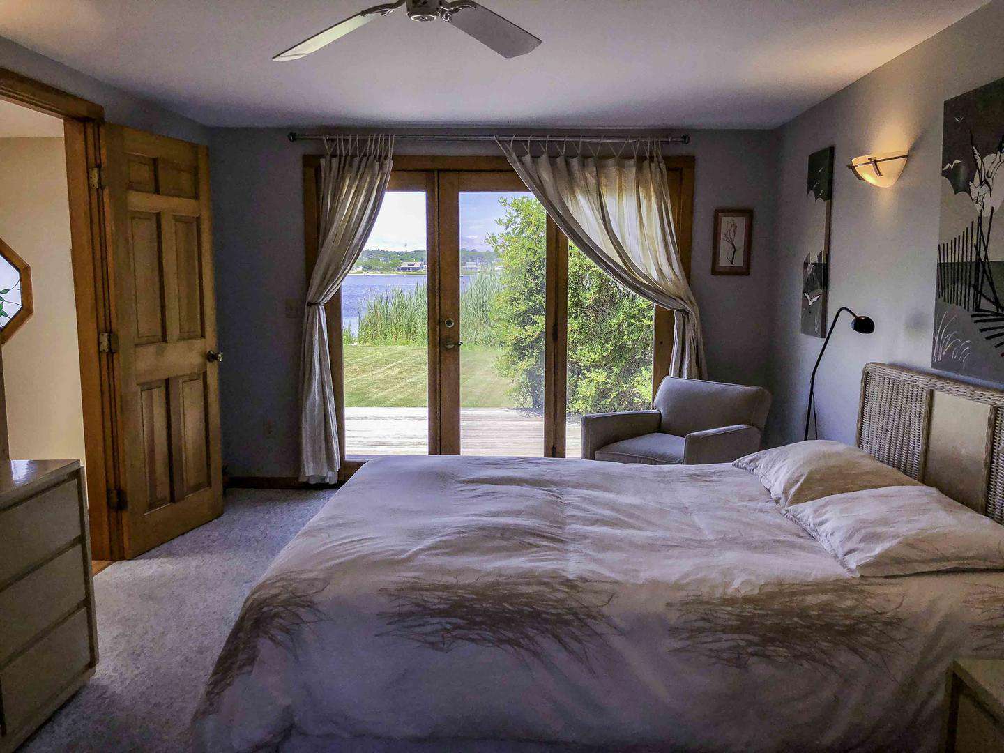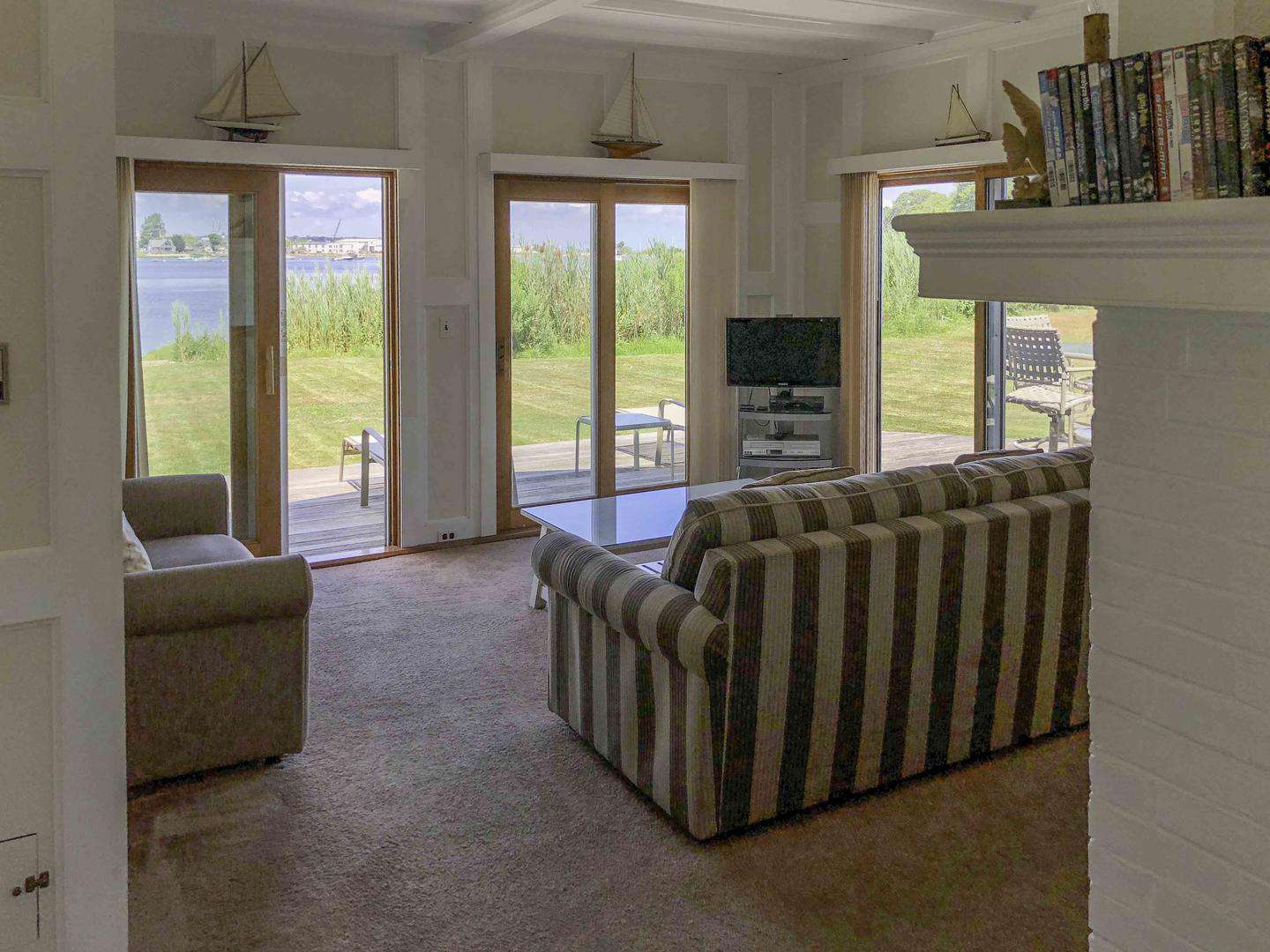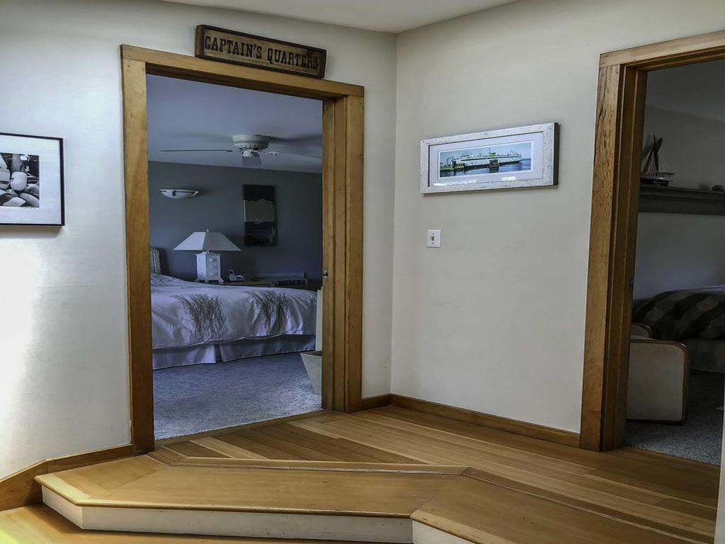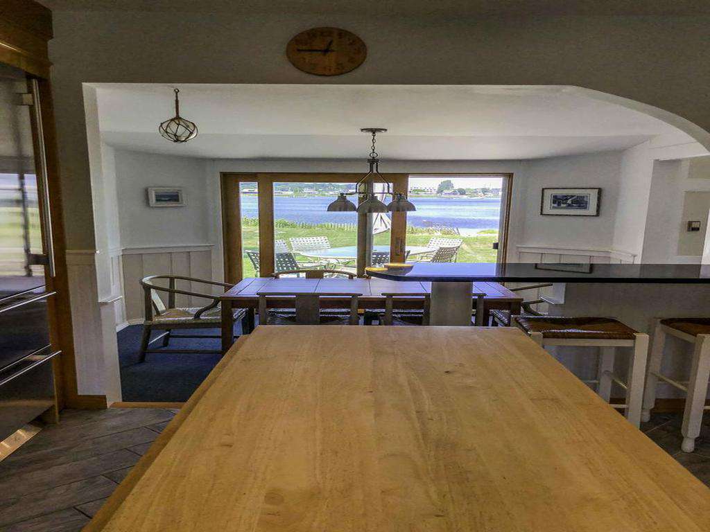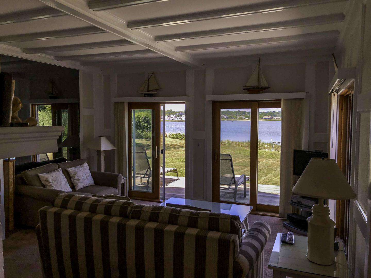 The sunken living room features three sliding glass doors, while French doors off the sunken dining room and primary bedroom all open to sweeping water views. Each of these rooms flows seamlessly onto a large wraparound deck, creating an effortless indoor–outdoor lifestyle. From the deck, it’s just steps to approximately 120 feet of direct waterfront, ideal for relaxing, launching kayaks, or enjoying the ever-changing harbor scenery.