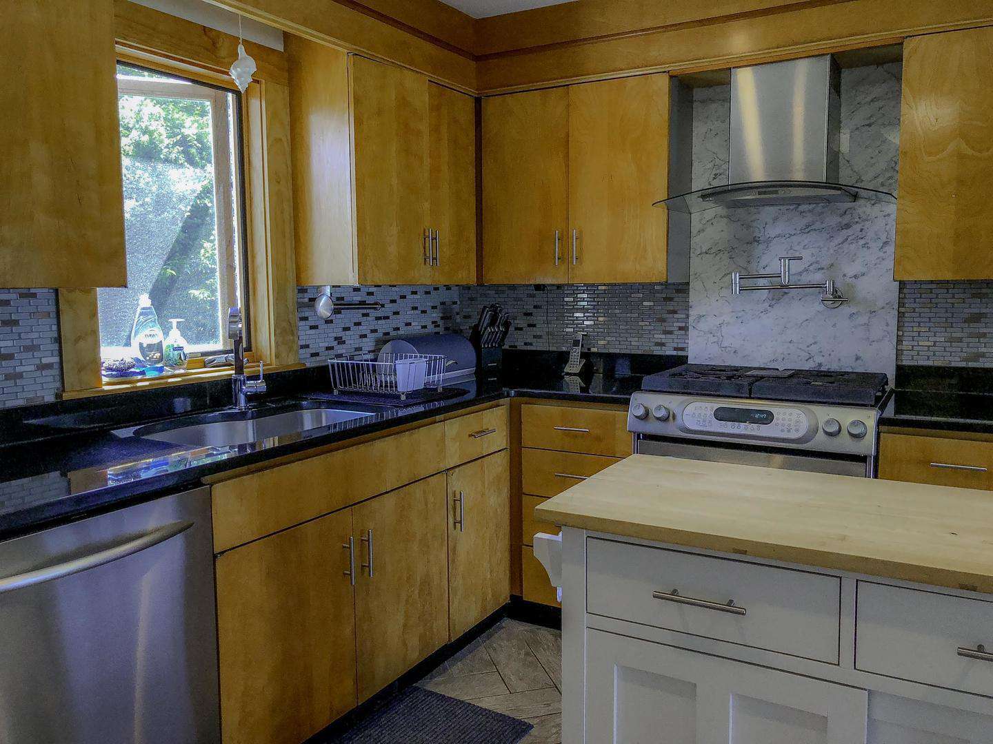 The kitchen is stocked for real use, featuring a coffee maker, oven, stove, refrigerator, microwave, dishwasher, dishes, and utensils—everything needed to cook, entertain, or keep things simple.