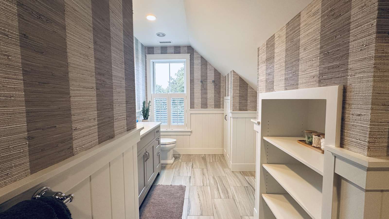 One of the most inviting spaces in the home is the screened porch featuring a fireplace and television, creating a cozy yet sophisticated setting for evening conversations, watching a game, or relaxing after a day exploring the island.