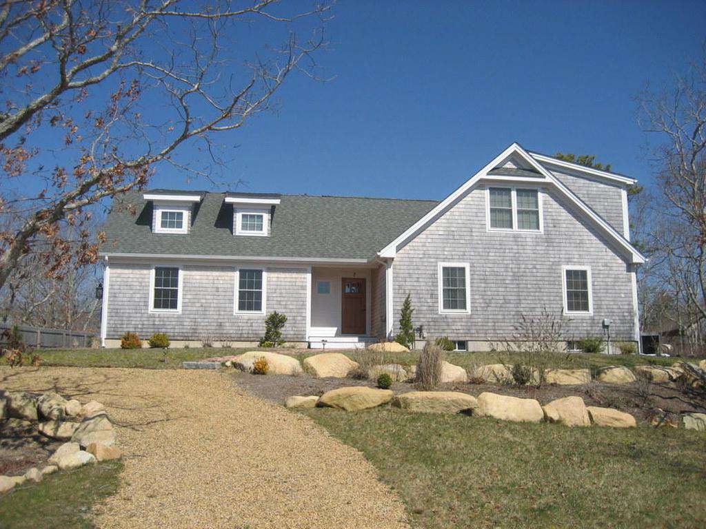 This bright contemporary home in Dodger’s Hole features vaulted ceilings, an open great room, gourmet kitchen, central A/C, flexible sleeping spaces, and a full-length deck—an ideal base for relaxed Martha’s Vineyard living.