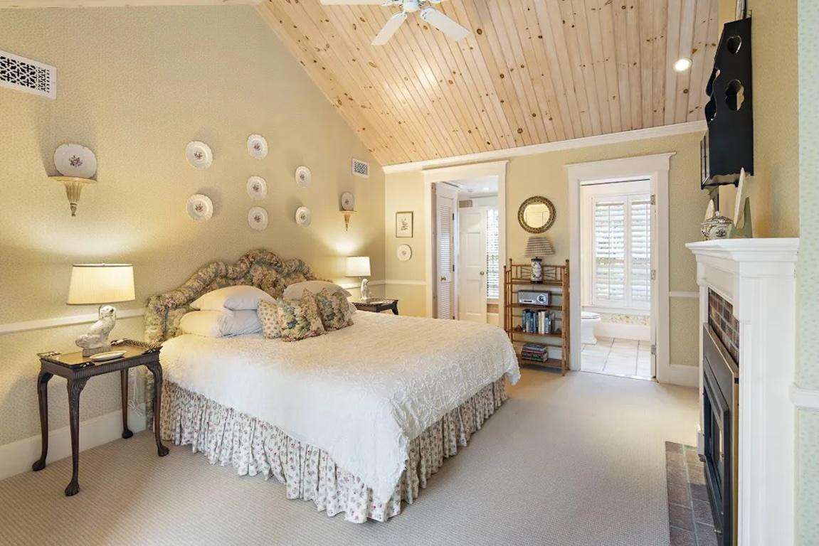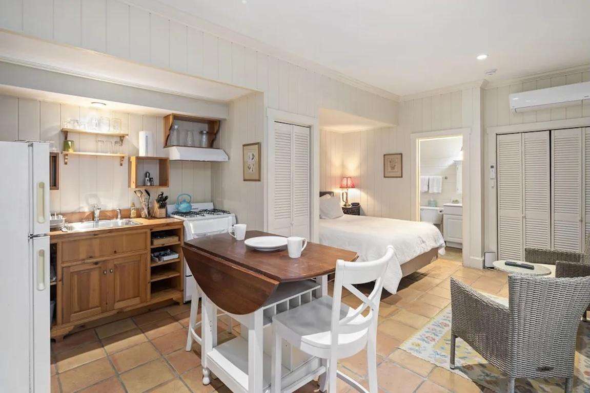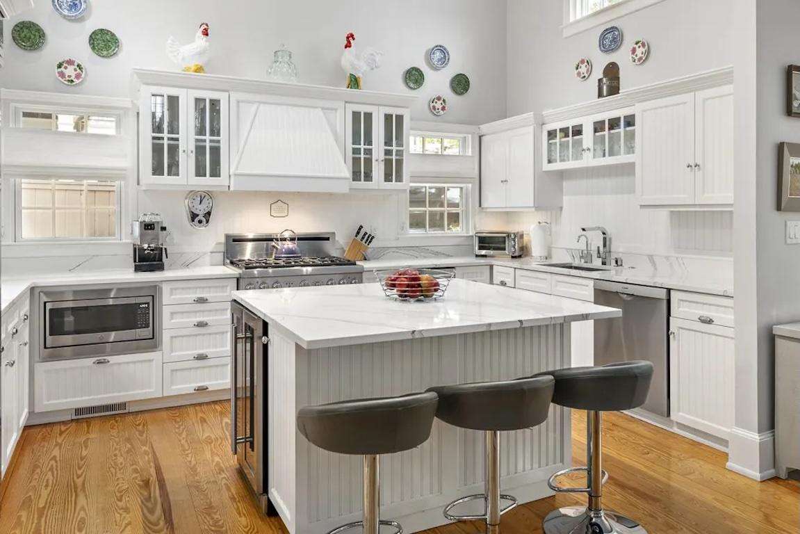 The main house is filled with natural light and designed for gathering and privacy. The great room features a wood-burning fireplace (but only to be seen, not used) and a large-screen TV, while the formal dining room seats eight for memorable meals. A chef’s kitchen with vaulted ceiling, quartz countertops, and stainless steel appliances opens to a breakfast bar for casual mornings.