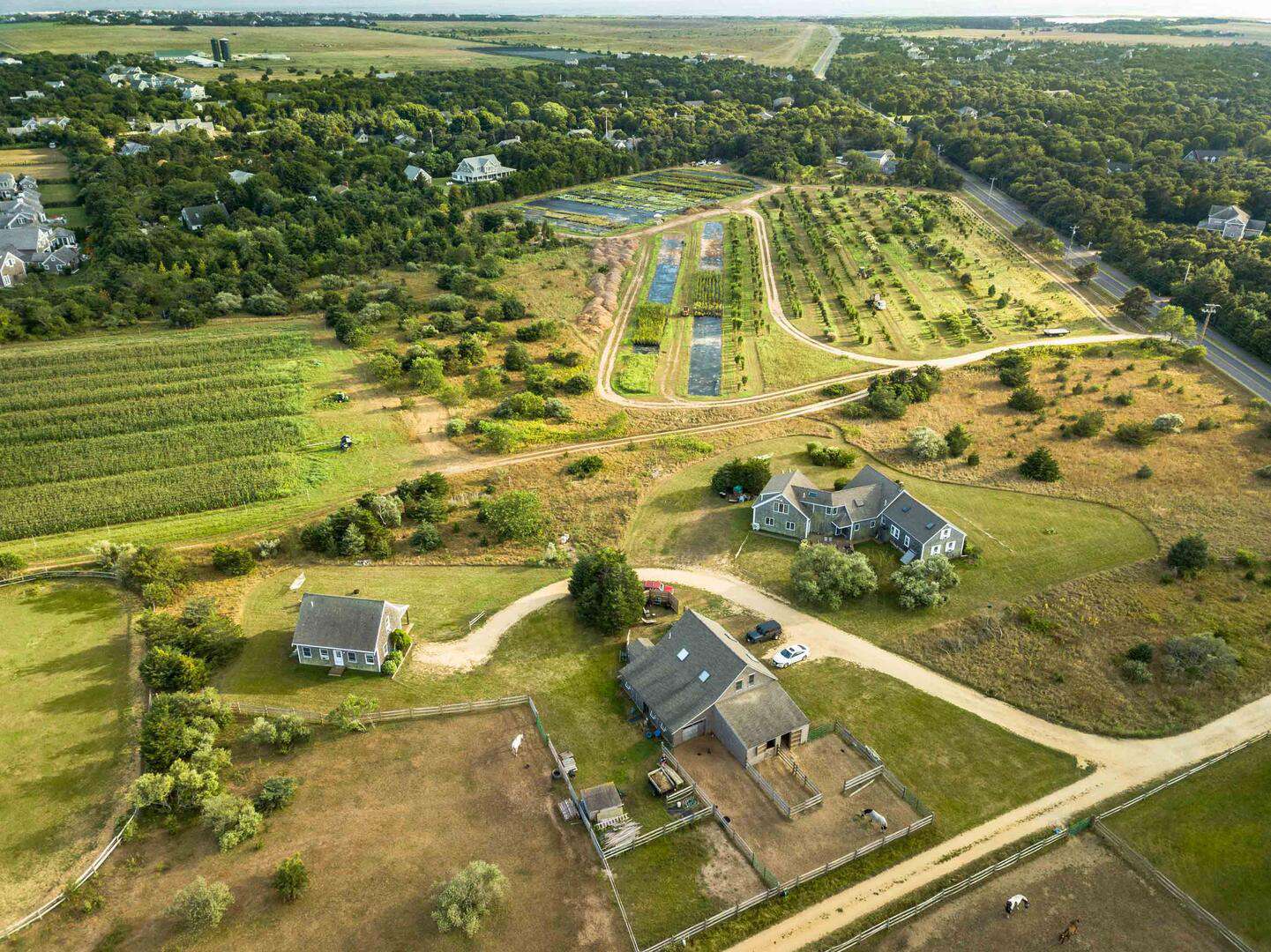 Set in the heart of Katama, this gracious farmhouse at 81 Herring Creek Road offers a rare combination of space, scenery, and relaxed Vineyard living. Situated on more than four acres, the home enjoys sweeping views across 50 acres of protected conservation fields, where wildflowers, open pasture, and a working horse barn create a serene and ever-changing backdrop throughout the season.