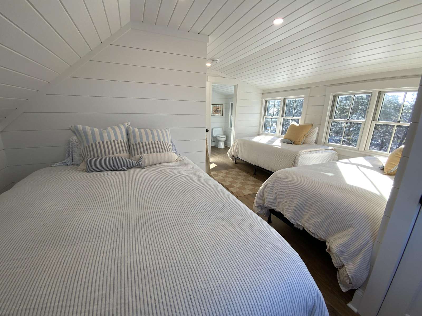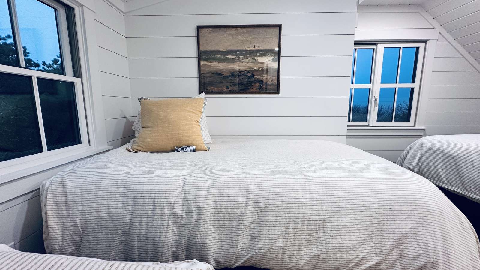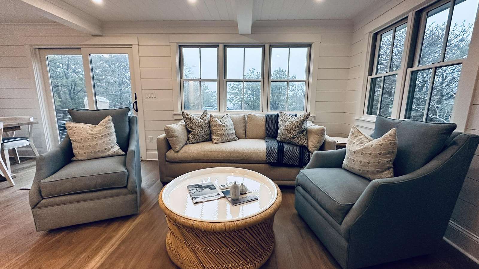 The home’s quiet bedrooms provide peaceful retreats after days spent exploring the island, while the refreshed layout allows for easy flow between indoor and outdoor living—perfect for laid-back summer rhythms or cozy fall stays.