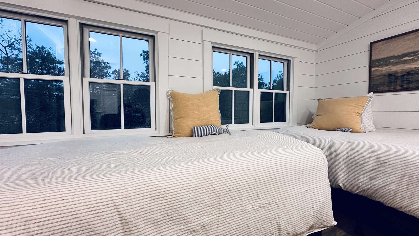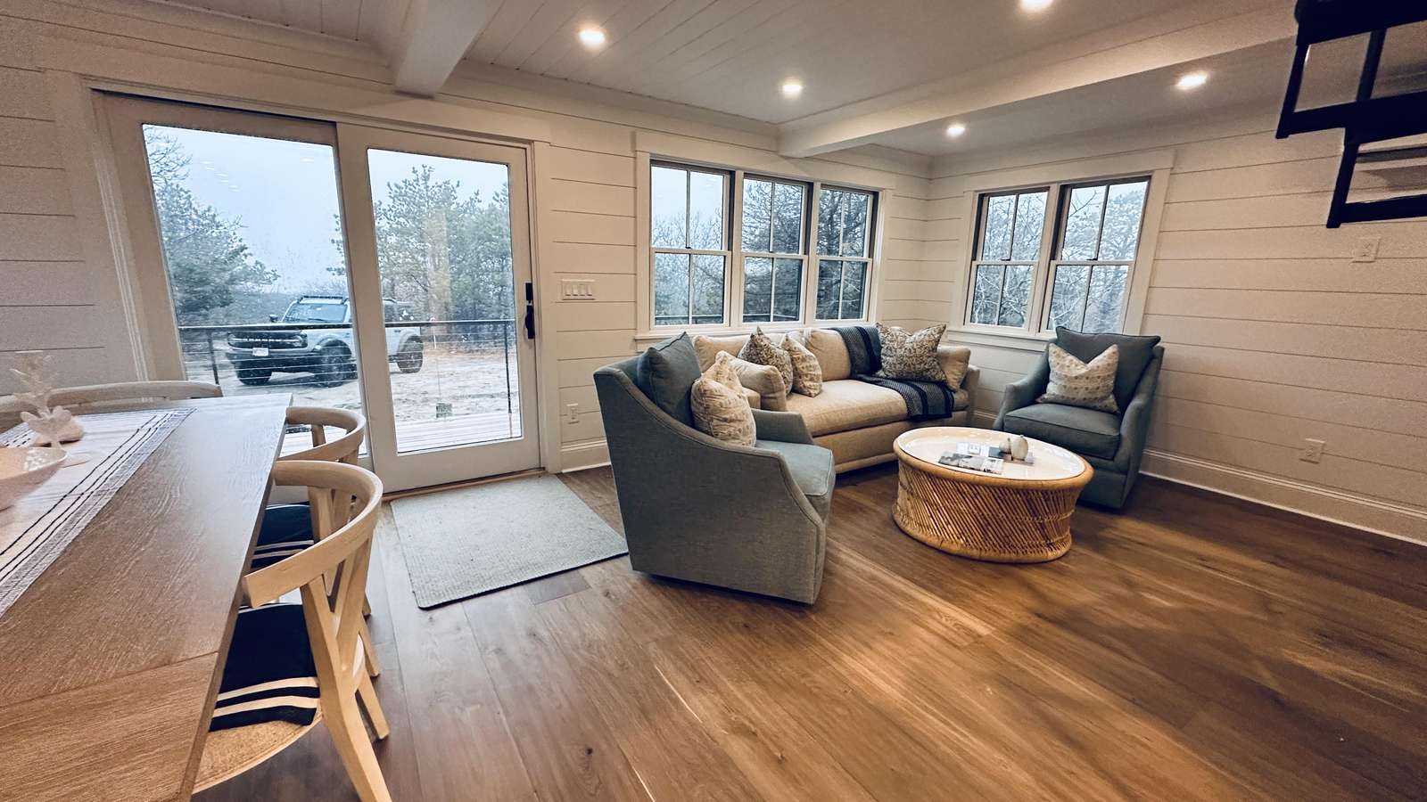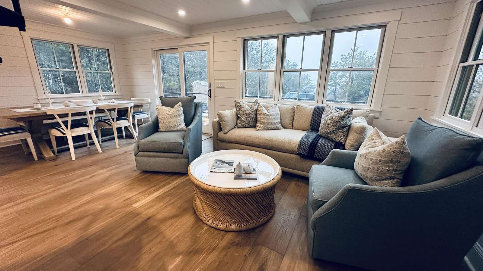 The home’s quiet bedrooms provide peaceful retreats after days spent exploring the island, while the refreshed layout allows for easy flow between indoor and outdoor living—perfect for laid-back summer rhythms or cozy fall stays.